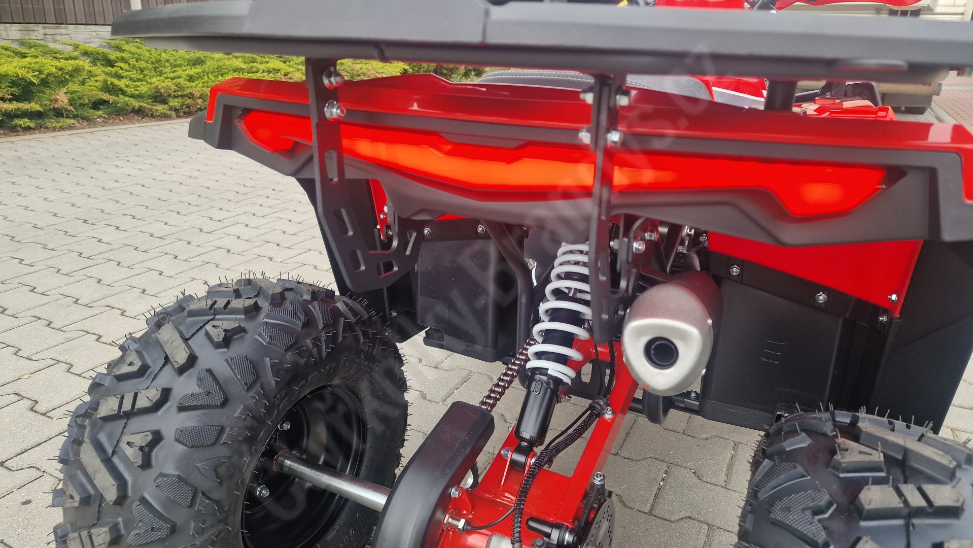 Čtyřkolka je vybavena 8" koly, což jí umožňuje plynulý pohyb i v náročnějším terénu. Maximální doporučená hmotnost jezdce je 80 kg.